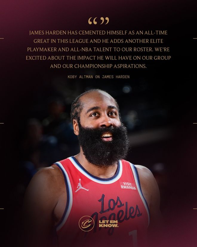 騎士籃球運營總裁科比-奧爾特曼在一份聲明中表示:“詹姆斯-哈登早已躋身聯盟歷史巨星之列,他的加盟將為我們的陣容再添一位精英級組織核心與最佳陣容級別的實力戰將。”奧爾特曼表示,“我們十分期待他能為球隊帶來的改變,以及對我們爭冠目標的助推作用。他的到來將提升球隊的進攻水準,為隊友創造更多得分機會,同時在攻防兩端為球隊註入寶貴的季後賽經驗。”