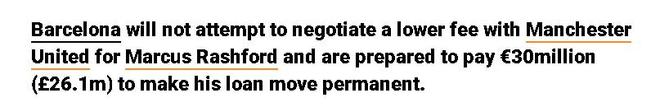 唯一可能導致轉會費發生變化的情況是,如果曼聯對巴薩陣中任何被認為多餘的球員表示出興趣,雙方可以進行交換,但目前還不存在這樣的球員。另一個可能影響巴薩買斷的是該隊換帥,幸好弗裡克的帥位似乎頗為穩固,而他非常欣賞拉什福德,力主引進。