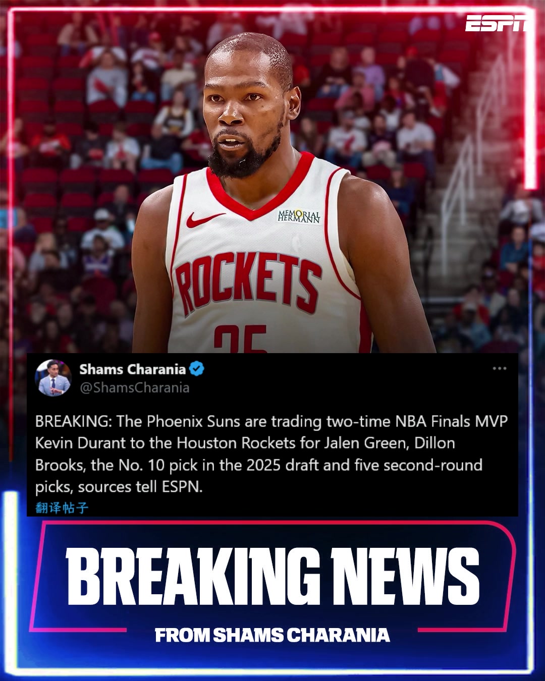 突发Shams杜兰特前往火箭换格林狄龙10号签5次轮